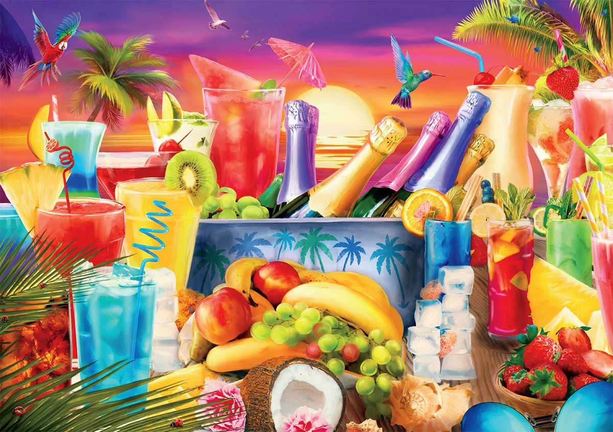 Welcome to Happy Hour at this island paradise. All of your favorite tropical drinks are here including, Mai Thais, Sangrias, Pina Coladas and not to mention, endless bottles of champagne. Enjoy piecing together this fun and vibrant jigsaw puzzle. This 300 piece puzzle is titled Happy Hour 2 and is part of the Vivid Collection by Buffalo Games. ย