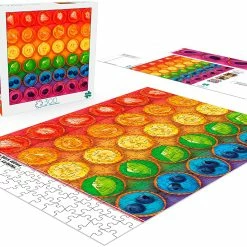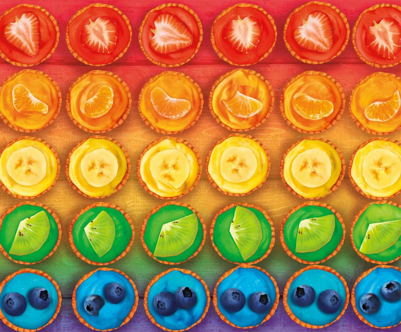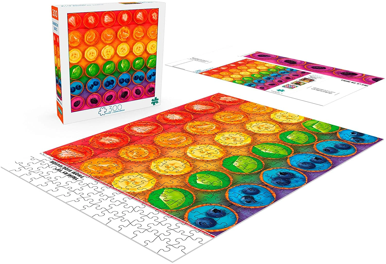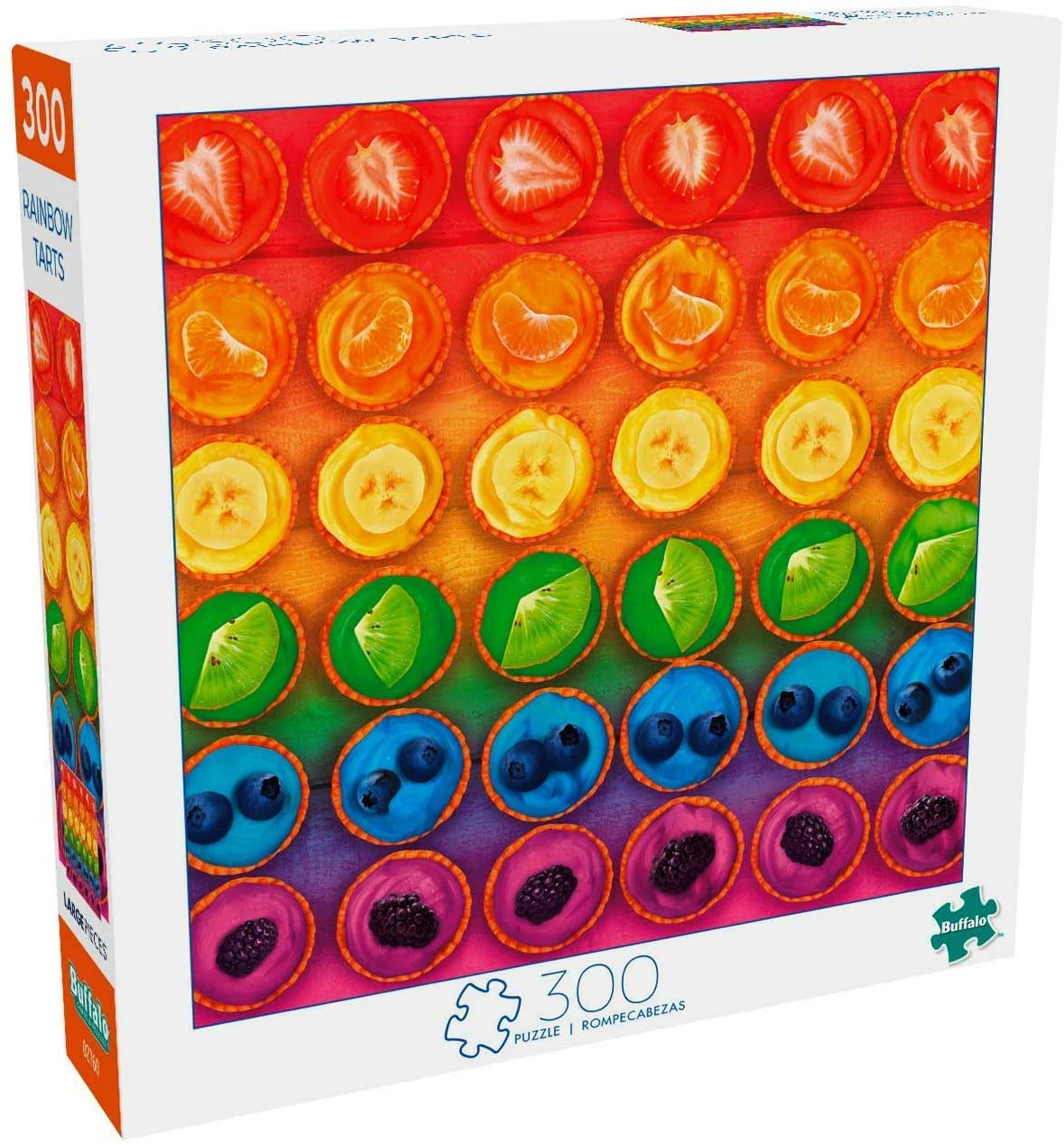 This 300 large-piece puzzle, Rainbow Tarts, is part of the Art of Play series by Buffalo Games. It pictures an esthetically pleasing and delicious looking set of mini tarts in every color of the rainbow. Which one would you eat first?