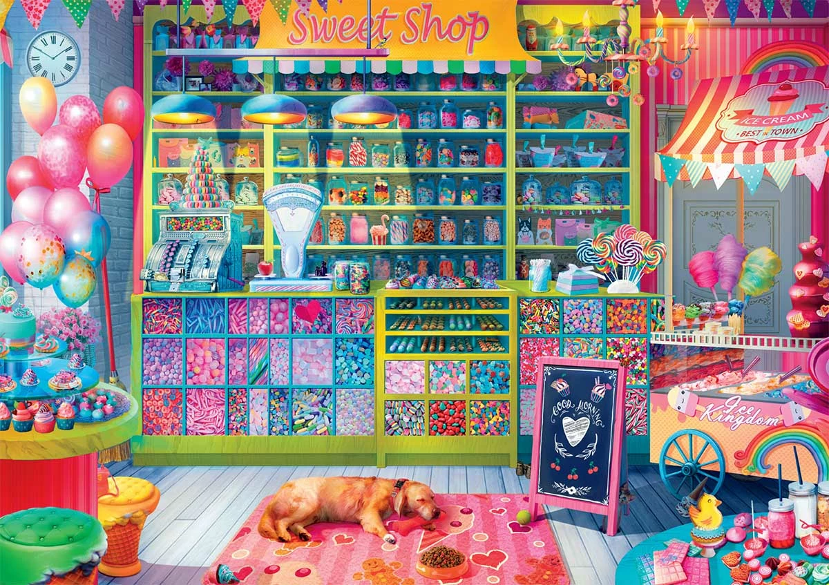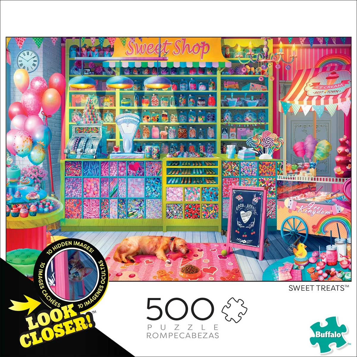 This 500-piece jigsaw puzzle, Sweet Treats, is from the Look Closer Series by Buffalo Games. This puzzle features a bright and colorful candy store that is filled with delicious confections! Ice cream, cotton candy, lollipops, cupcakes, candies, and more line the shelves of this wonderland of desserts. The Look Closer Series puzzles all contain hidden images that the puzzler can search for while completing their puzzle!