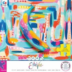 This 300 piece puzzle by artist, Sarah Phillips known for food photography, depicts a colorful collage of avocados, tomatoes, and flowers.