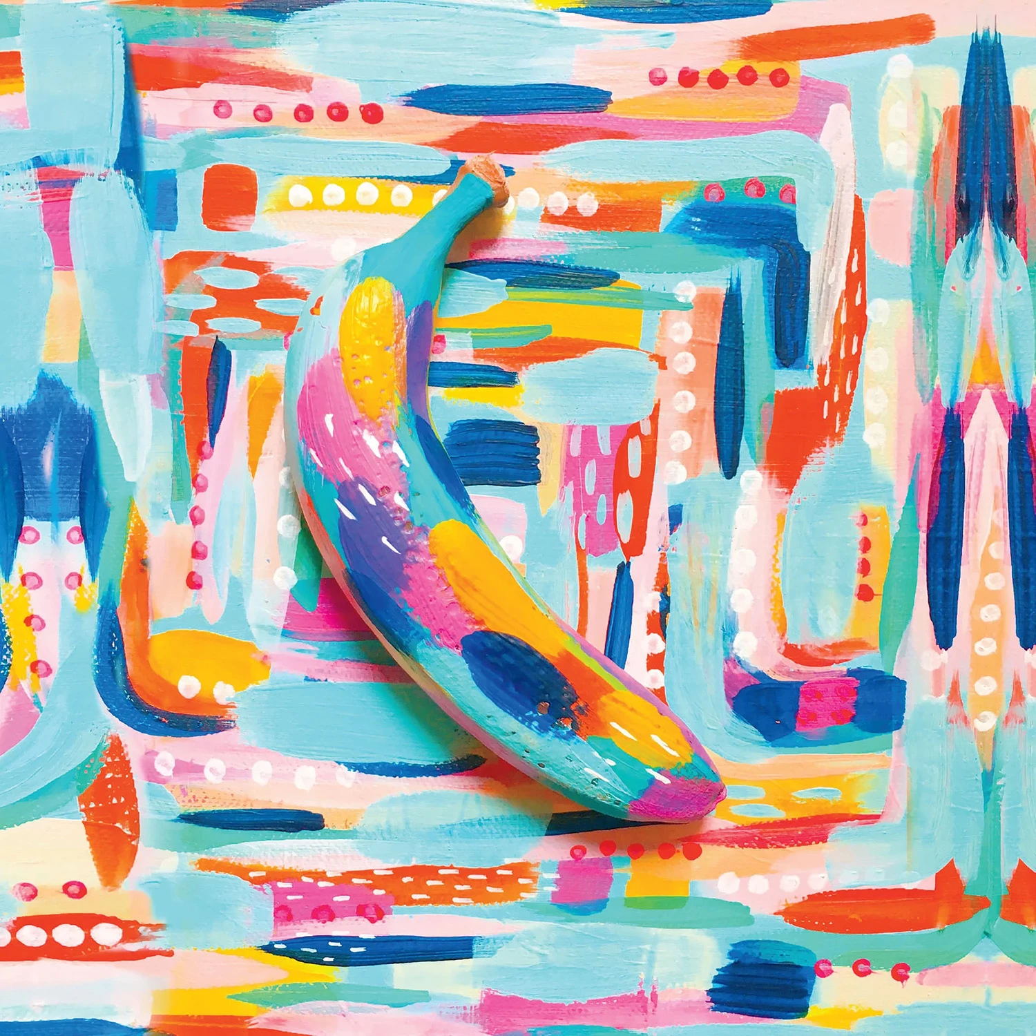 This 300 oversized piece Etta Vee puzzle features a bold and vibrantly colorful abstract pattern with a banana in the center. Artist, designer, social media influencer, Jessi Raulet, has become well known for her hand-painted designs. Etta Vee is her lifestyle brand that expresses optimism and joy through color. The puzzleβs dimensions are 19″ x 19″.