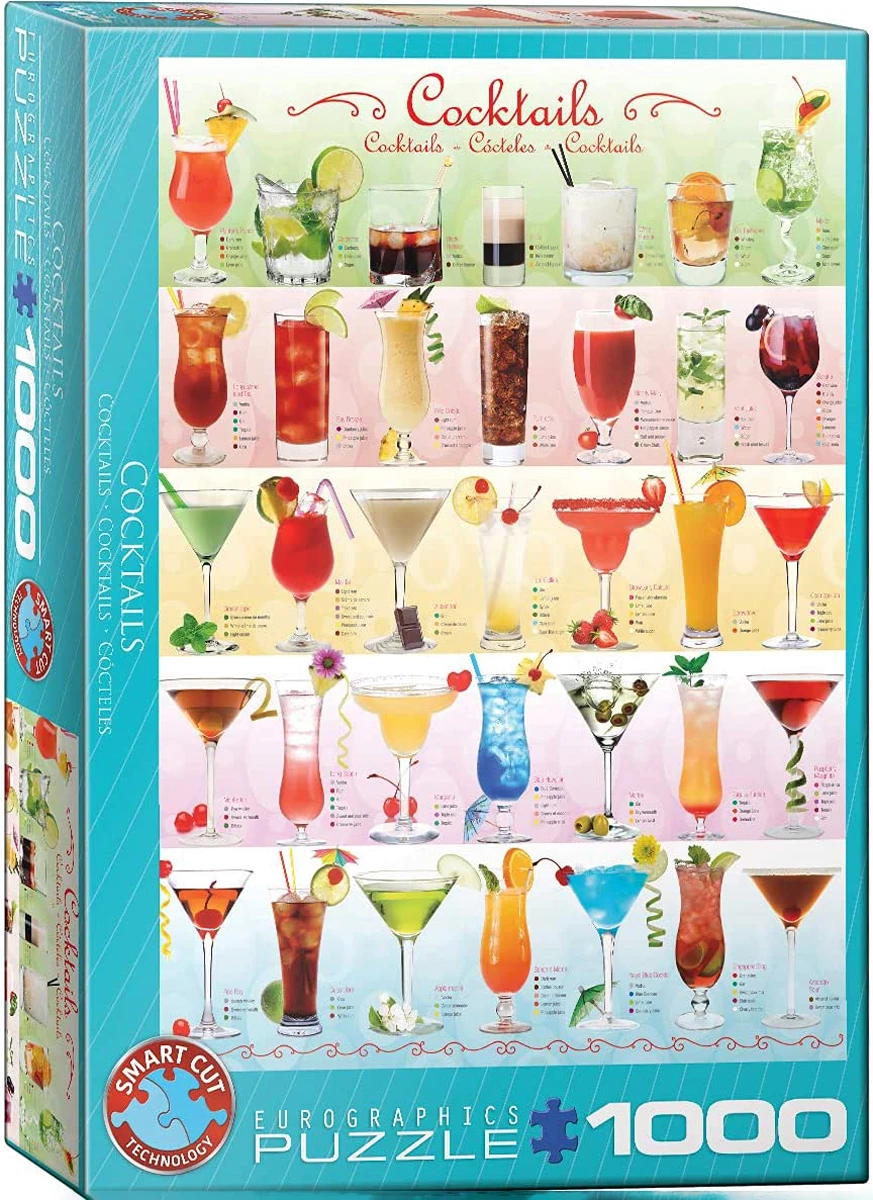 Cocktails is a 1000 piece jigsaw puzzle from EuroGraphics. Puzzle measures 19.25″ x 26.625″ when complete. Recipes included in box for you to make your own goodies while you puzzle!