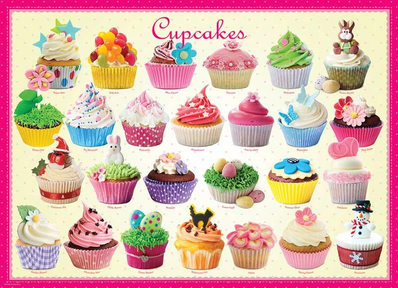 300 piece Large Piece jigsaw puzzle from EuroGraphics featuring pieces that are larger to see and hold easily. These puzzles measure the same as a standard 1000pc from the same brand. Puzzle Dimensions: 19.25 x 26.5. Enjoy a delectable assortment of cupcakes without the calories! Recipe included on the back of the box. Released 2013.