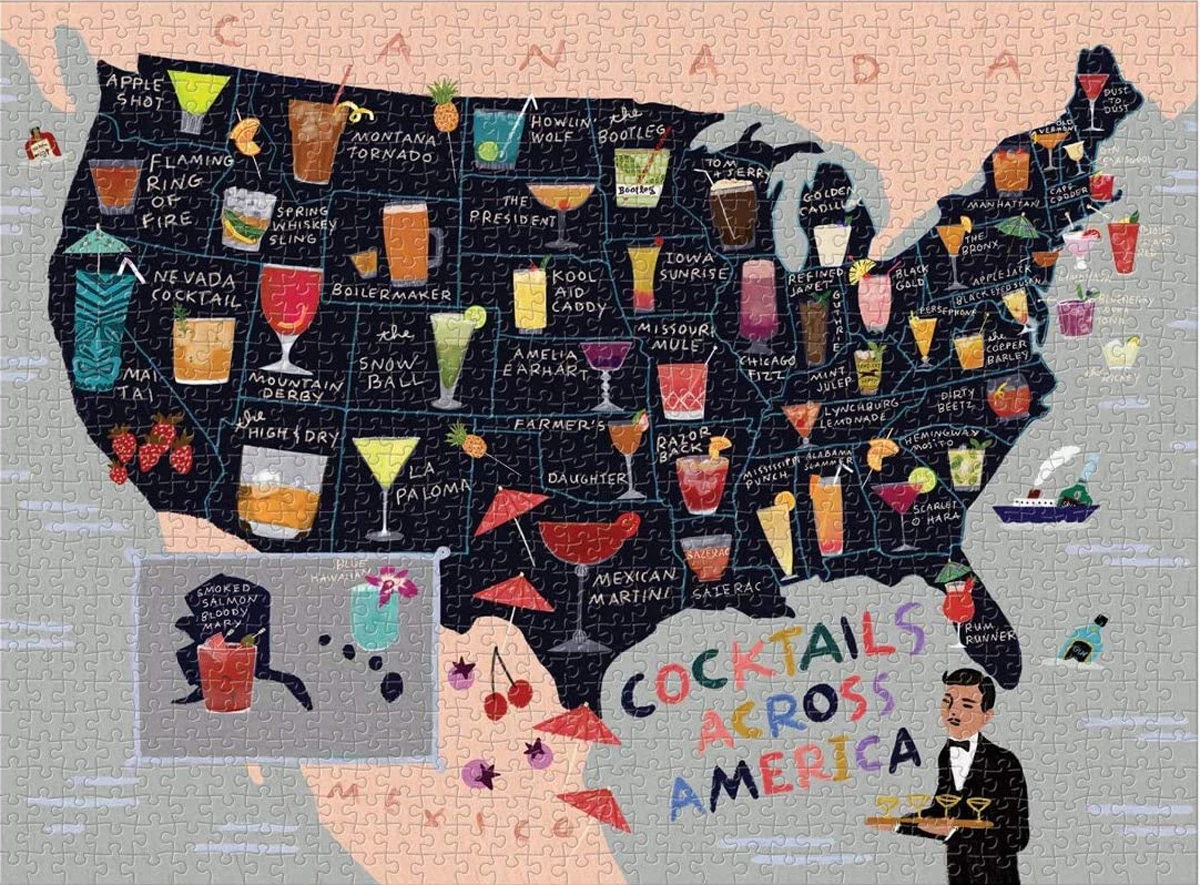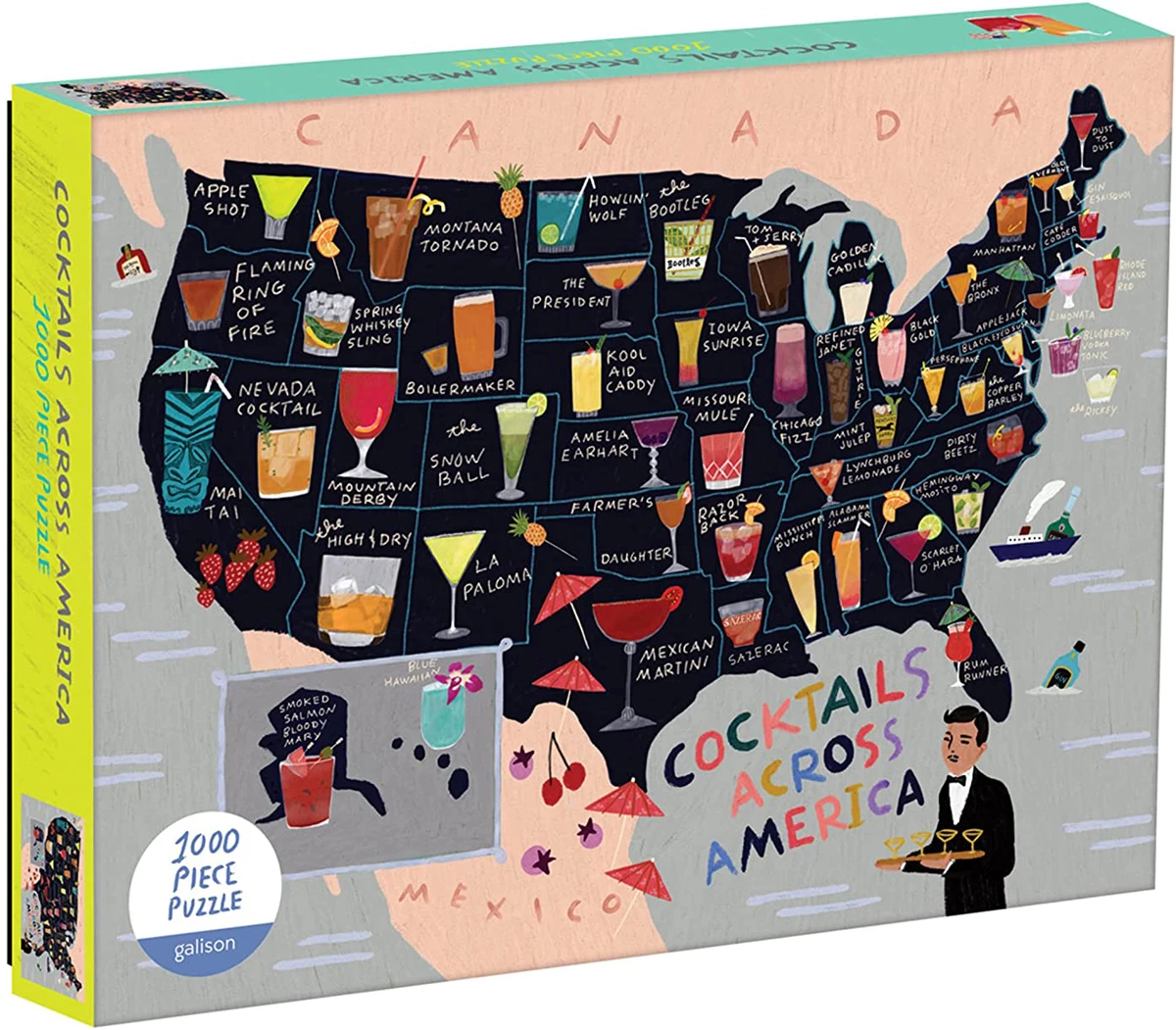 Cocktail Map of the USA 1000 Piece Puzzle features Anne Bentleyβs painting of the U.S featuring signature drinks across the 50 states. Galison puzzles are packaged in matte-finish sturdy boxes, perfect for gifting, reuse, and storage.