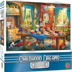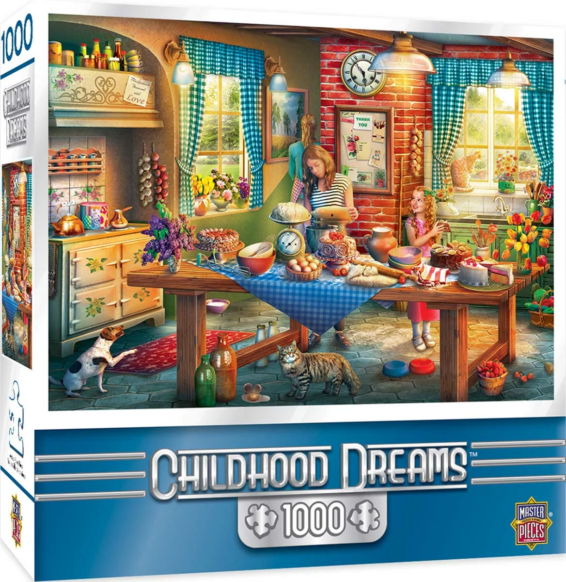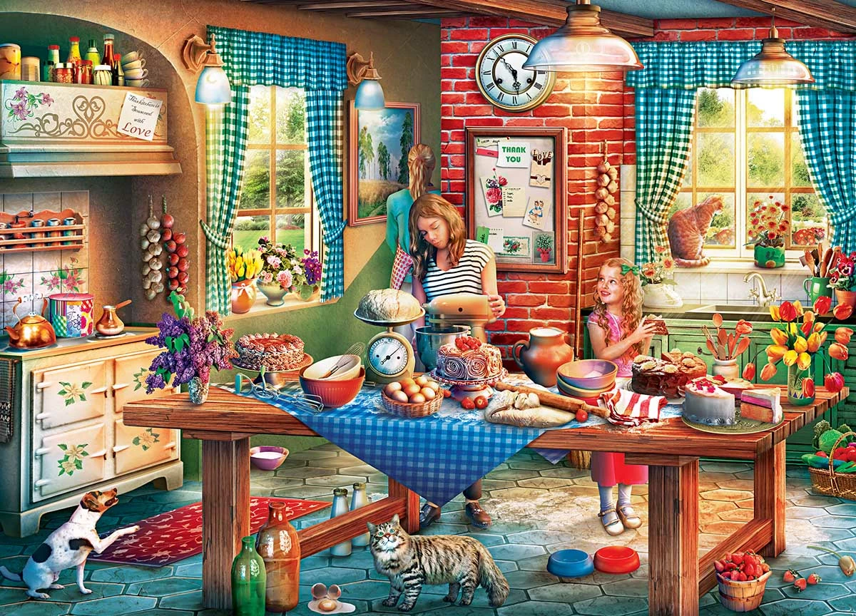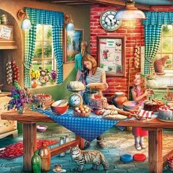 As you put together this 1000 piece puzzle by MasterPieces you will begin to step inside the kitchen as two young girls help bake bread as colorful flowers surround them. From the flour on the floor to the dog begging for food, making it seem like you are inside the image itself. This puzzle is perfect for any baker!Β