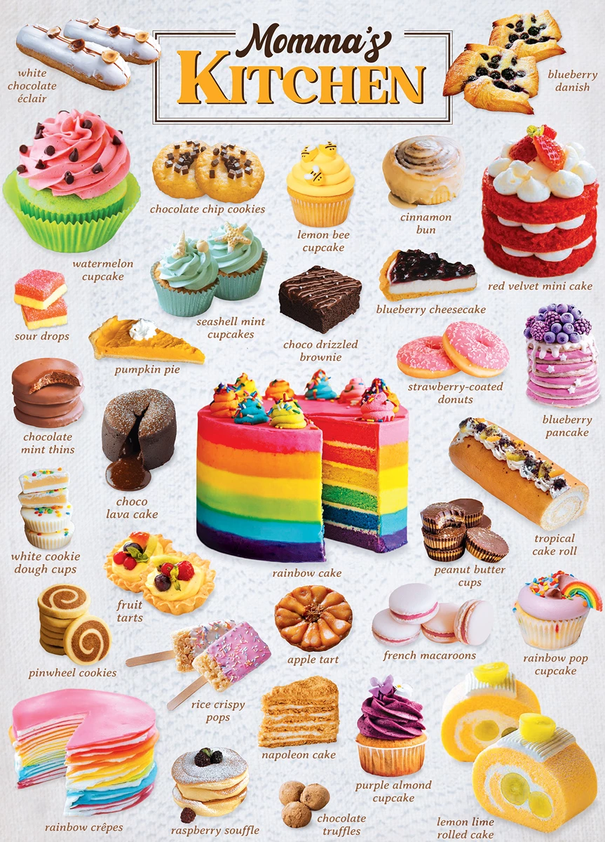 These delicious treats are freshly made from Momma’s kitchen! Pinwheel cookies, delicate fruit tarts, blueberry pancakes, and a big, beautiful rainbow cake are among the sugary snacks featured in this fun puzzle. This colorful collection of homemade desserts is perfect for the puzzler with a sweet tooth!