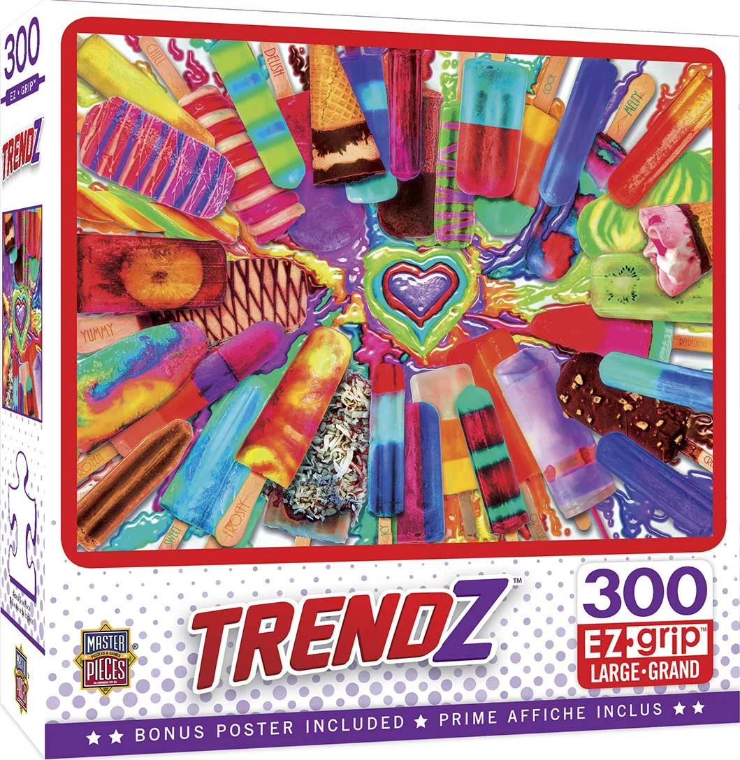 This MasterPieces 18″ x 24″ 300pc EZ Grip Trendz Collection features hip images of favorable styles, or influences we see trending today. Refreshing summer treats are cool and crisp on a hot day. Gobble up this delicious trend with every ice cream flavor under the sun. The EZ-Grip die-cut used to make this puzzle offers larger puzzle pieces that snap together perfectly, without compromising image quality. To reduce its impact on our environment, the chipboard used in this puzzle is made of recycled material.