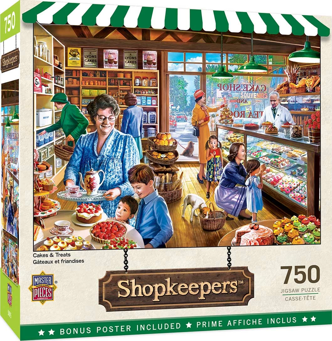 This MasterPieces 750pc Shopkeepers Puzzle features a variety of store fronts. From inside an antique shop to an orderly grocery store each image is sure to be unique in its own way. Getting ready for Saturday Supper, all the town ladies stop by to see the weekend’s fancy cakes. To reduce its impact on our environment, the chipboard used in this puzzle is made of recycled material.