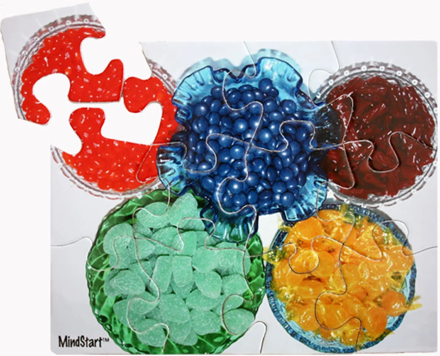 For dementia patients, jigsaw puzzles with many pieces and detailed images are too difficult. MindStart puzzles, designed by an occupational therapist, are unique because the images have only a few, simple objects in each image, making it easier for the user to find pieces that go together. This design feature, along with having fewer puzzle pieces and images from adult life, allows the person with dementia to have the right level of mental stimulation and dignified success. Also, the large size of the puzzle pieces helps seniors with vision loss to easily see and handle the pieces. A research study showed that patients with dementia were able to set the MindStart puzzles more independently, with less cues needed, when compared to a childβs puzzle of the same size. This gives the person a sense of accomplishment and gives caregivers respite time.