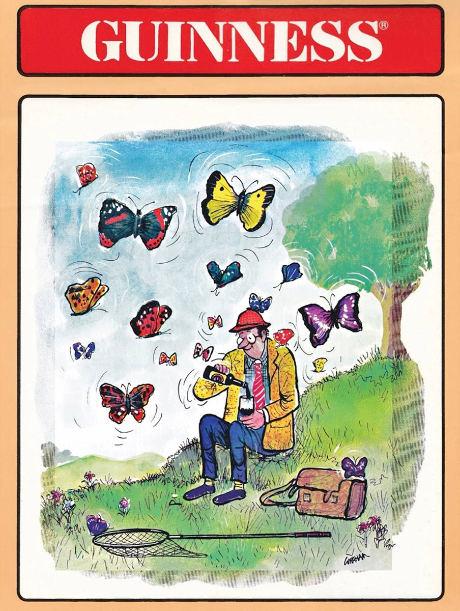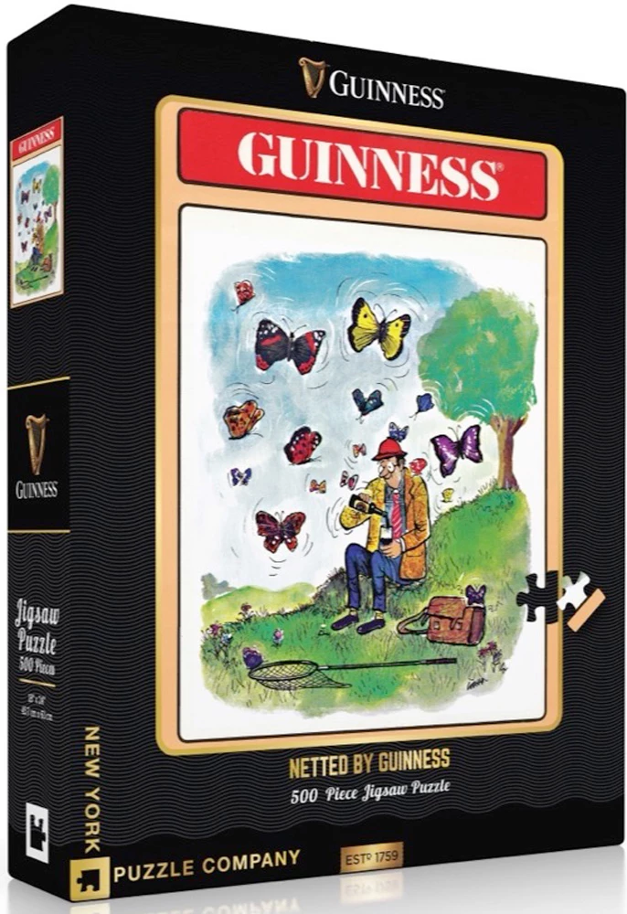 Break time! Piece together this puzzle of a gentleman taking a break from netting beautiful butterflies with a delicious Guinness beer!