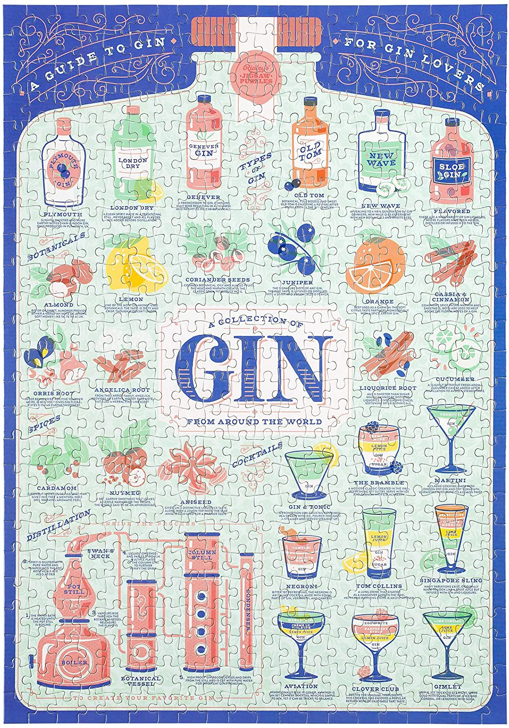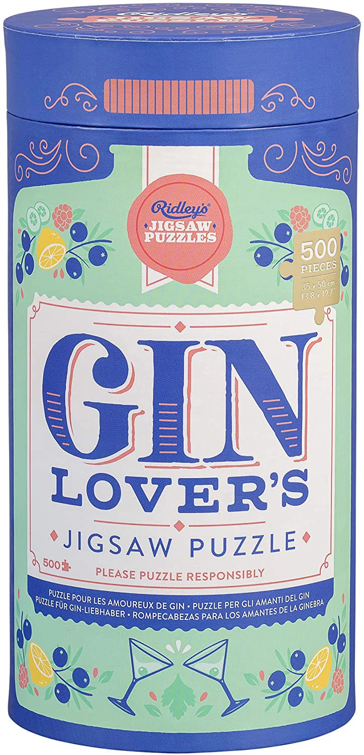 500-PIECE PUZZLE β Itβs all about the gin with the Gin Loverβs Jigsaw Puzzle from Ridleyβs! Featuring hand-drawn illustrations of gins, botanicals, spices and cocktails from around the world, thereβs something here for everyone.