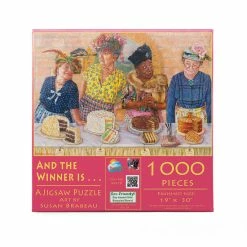 In the 1000 piece jigsaw puzzle, And the Winner is by SunsOut, an illustrate of four women presenting their baked cakes. The artist, Susan Brabeau, made this a colorful and detailed illustration. This 10+ puzzle has dimensions of 19″ x 30″ (48.26 x 76.2 cm) which makes it a fun and challenging activity to do with the entire family!