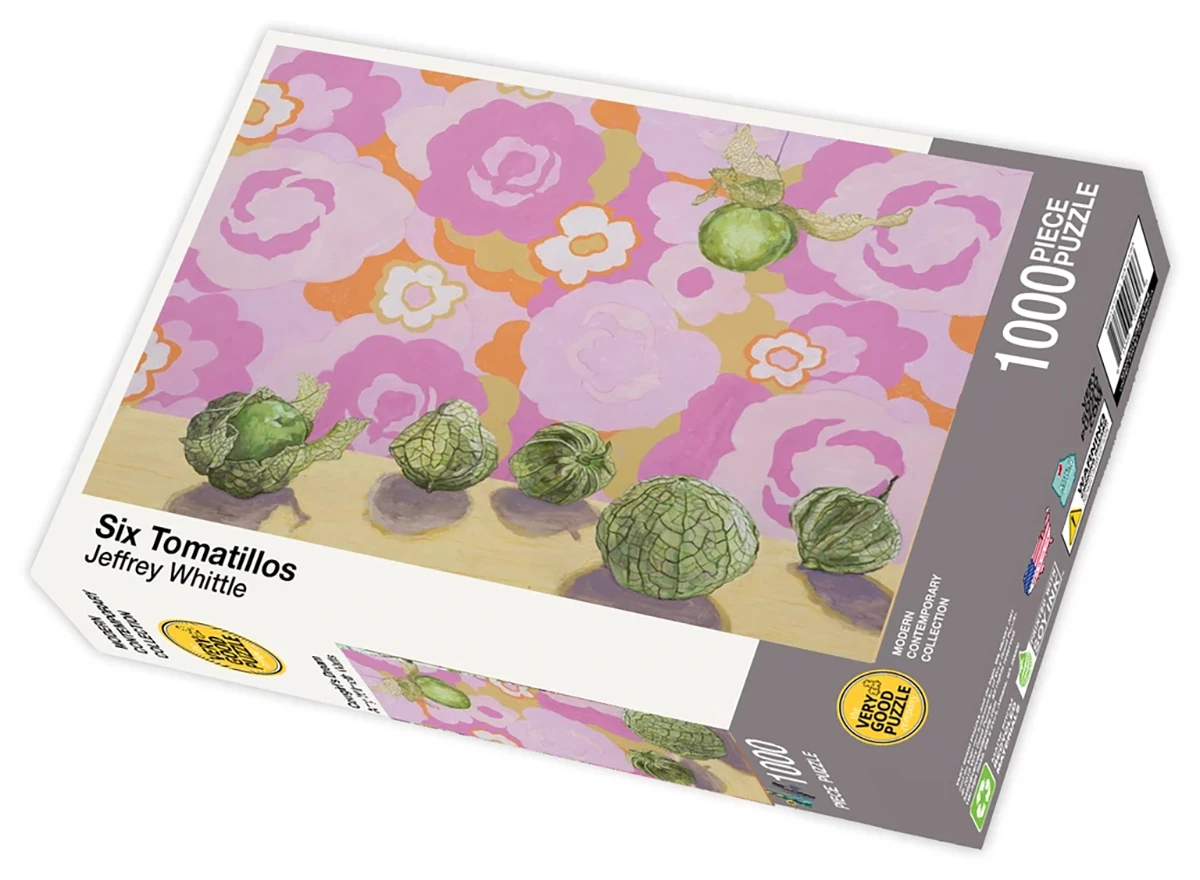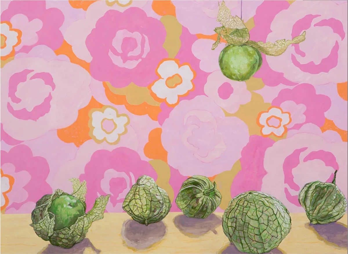 differences are a metaphor for human individuality. Each little green nightshade seems to have its own personality: shy and retiring, flirtatious, reserved, investigative, exhibitionistic. He says that he used their papery husks to suggest various stages of dress and undress. The backdrop is a piece of fabric from the 1960s that he bought at a thrift store, and you can tell that he has an interest in texture and pattern from the contrast between the natural and artificial objects. Whittle calls the scene a little stage, inspired by Spanish baroque still-life painter Juan SΓΒ‘nchez CotΓΒ‘n, who also suspended objects from strings to vary his images. The result, with one tomatillo dangling above the rest, is theatrical and slightly witchy.